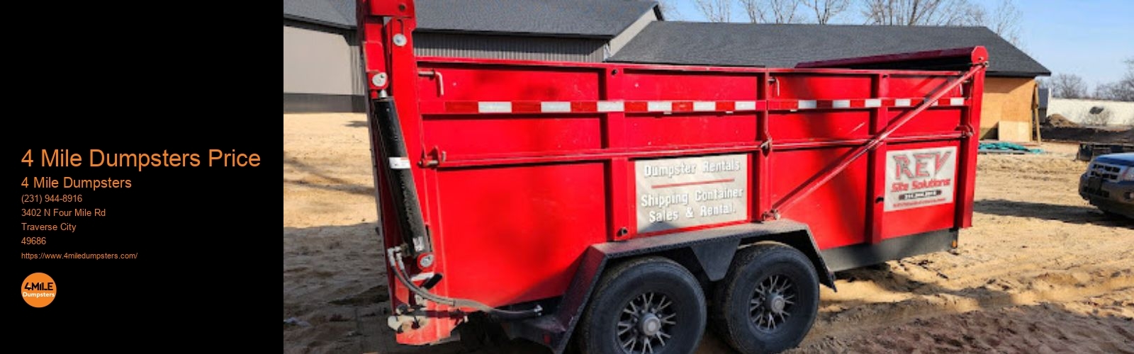 We have containers for many uses. Whether cleaning out your garage, renovating your kitchen, or managing a construction site, a dumpster can make the process much easier. 4 Mile Dumpsters offers competitive prices on all our dumpster rentals. Dustbin lorry These units are a great investment for anyone who needs extra storage space. 4 yard We understand that customers have different needs, so we provide various options. At 4 Mile Dumpsters, we are committed to good service.